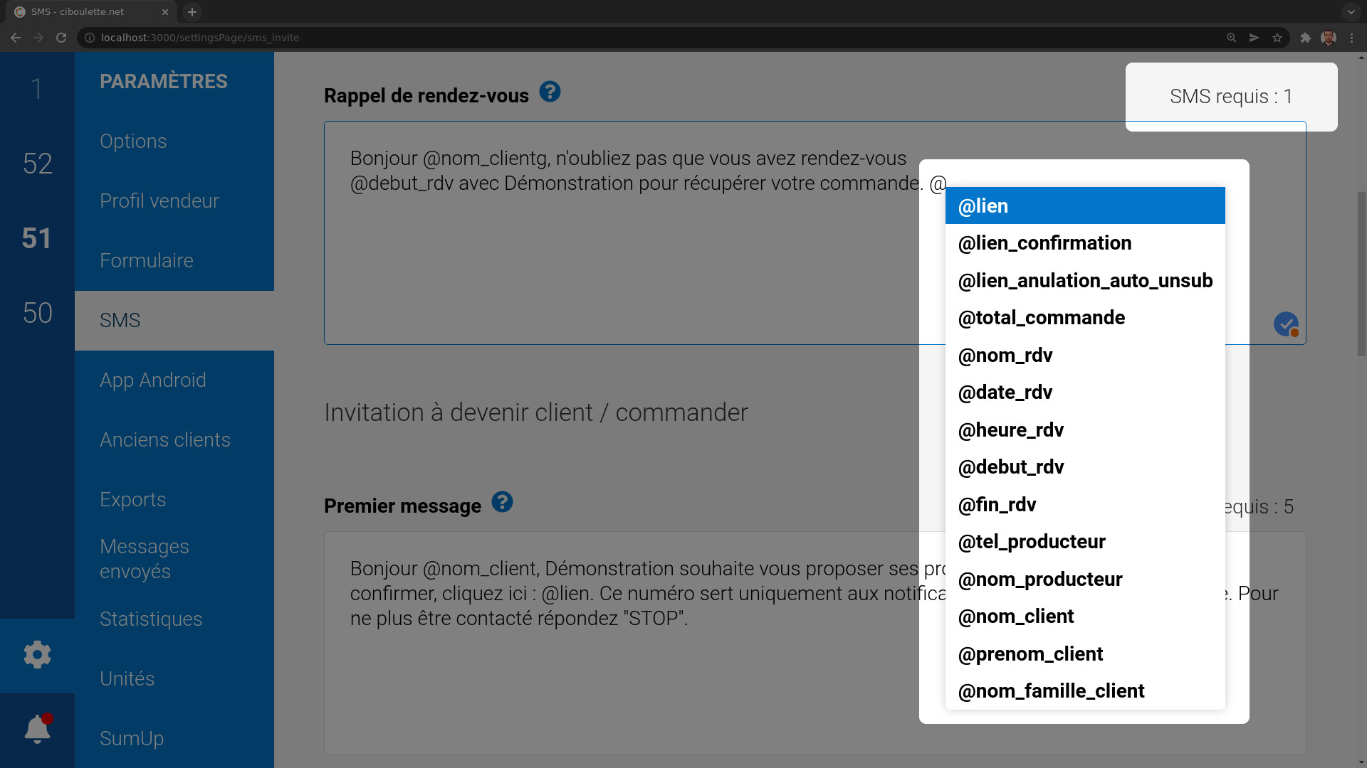 L'édition de modèles de SMS est améliorée, avec des suggestions de tag et une estimation du nombre de SMS requis par envoi.