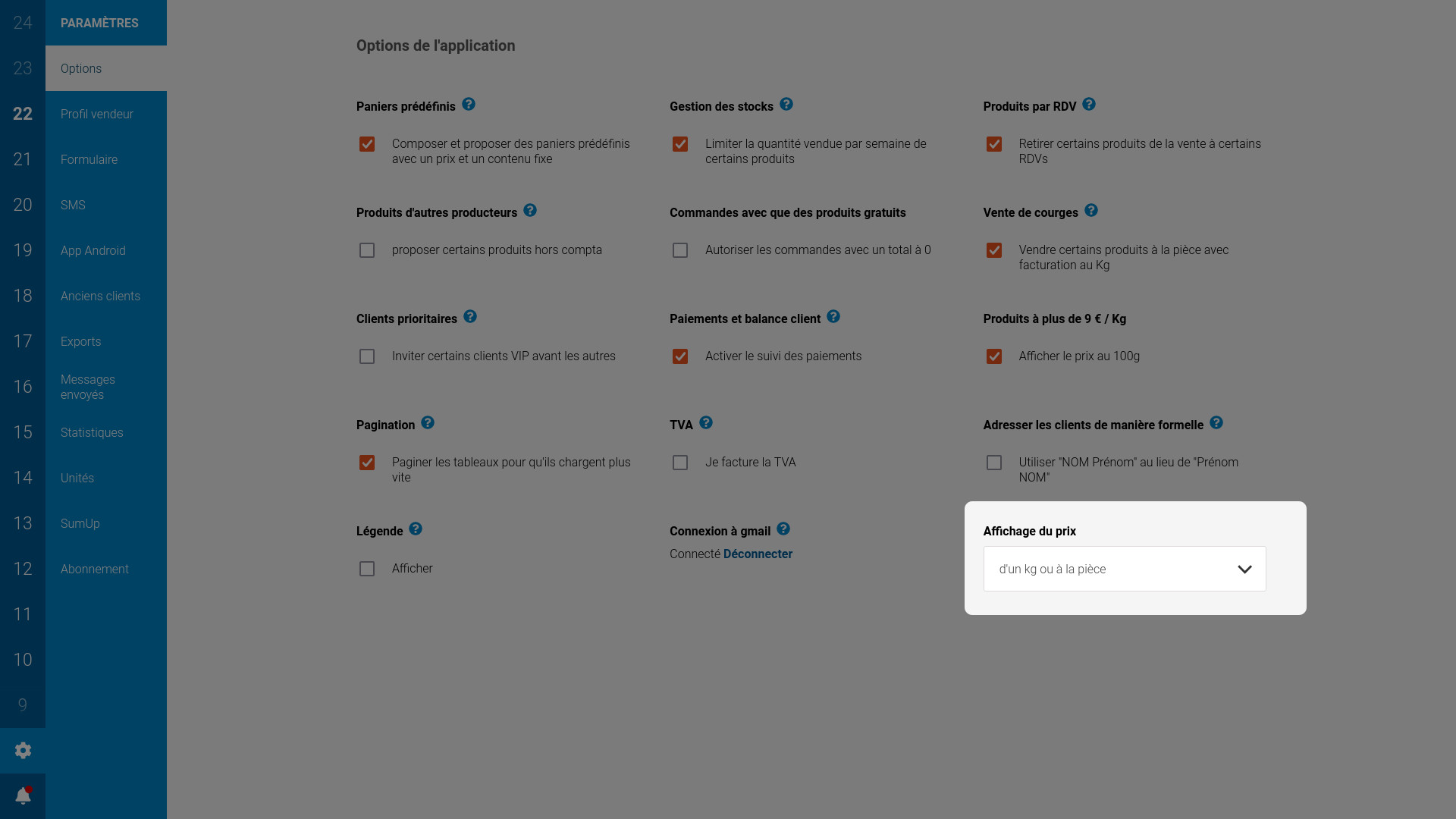 - Configuration de l'affichage du prix. Sur demande de producteurs, vous avez désormais trois options : afficher juste le prix au Kg, afficher seulement le prix de ce que commande le client, ou afficher les deux.