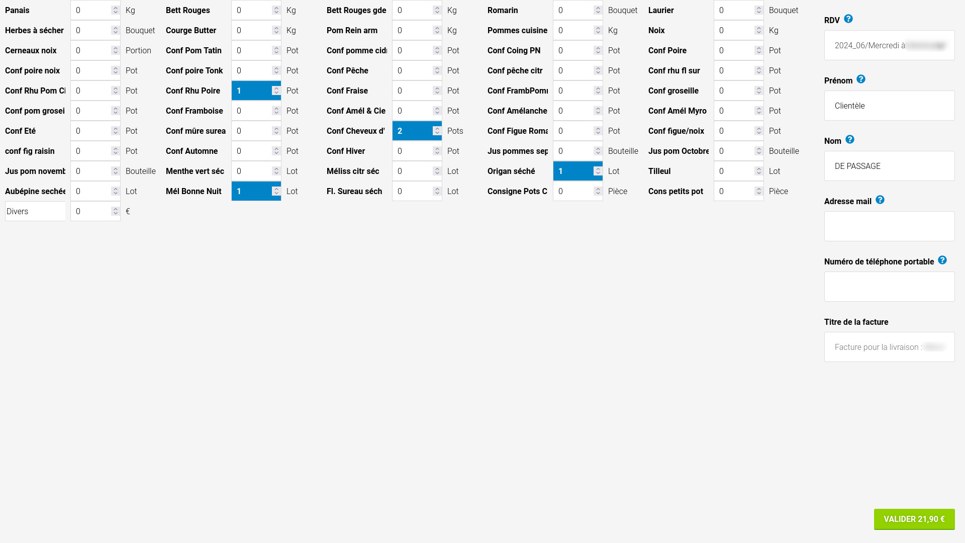 suivant : vous sélectionnez quelques produits, un rdv (s'il y a un RDV en cours de vente, il sera sélectionné) et un client (vous pouvez en définir un comme "client par défaut" dans les options), puis validez.