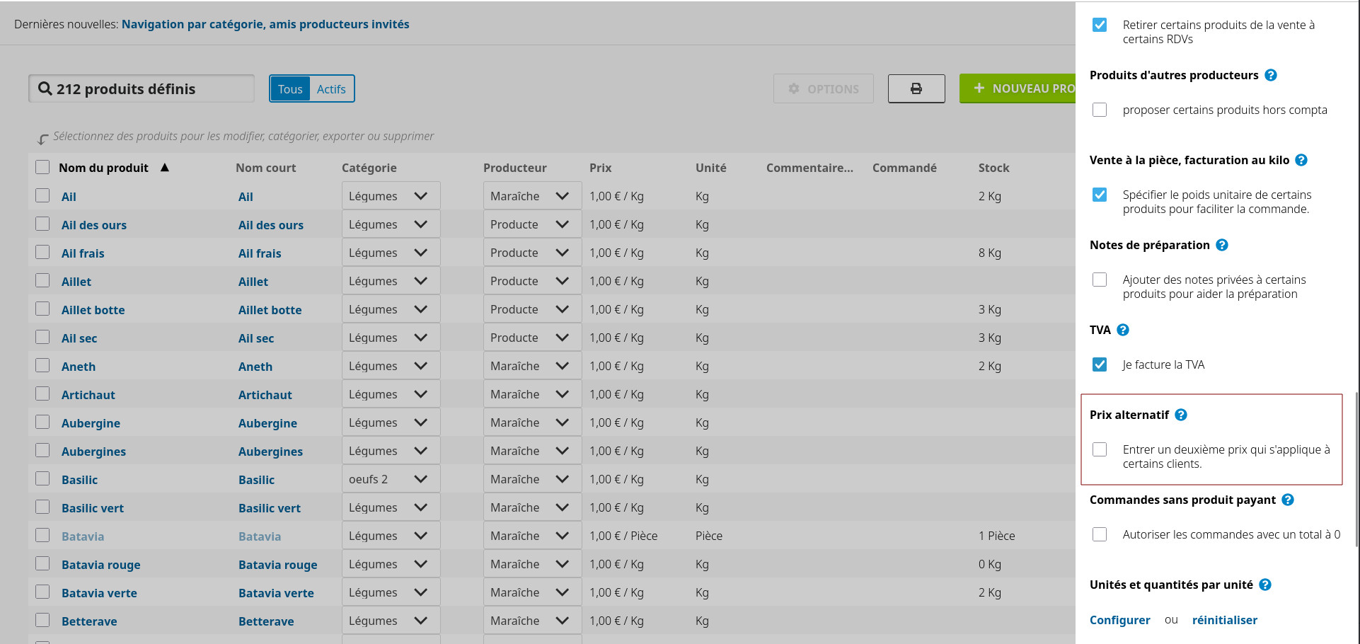 Cette nouvelle option a fait son apparition. Elle vous permet de spécifier un deuxième prix pour les produits et paniers. Celui-ci sera appliqué aux futures commandes des clients pour lesquels vous aurez coché l'option "prix alternatif". Ce prix est ensuite pris en compte partout, du logiciel de caisse au BL et factures.