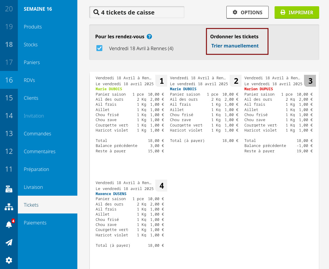 Le bouton pour trier le tickets n'est pas affiché en permanence, il faut choisir une disposition de tickets manuelle (sinon le trie est par longueurs de ticket) et un affichage en grand du numéro de commande (sinon les tickets sont triés par ordre alphabétique).