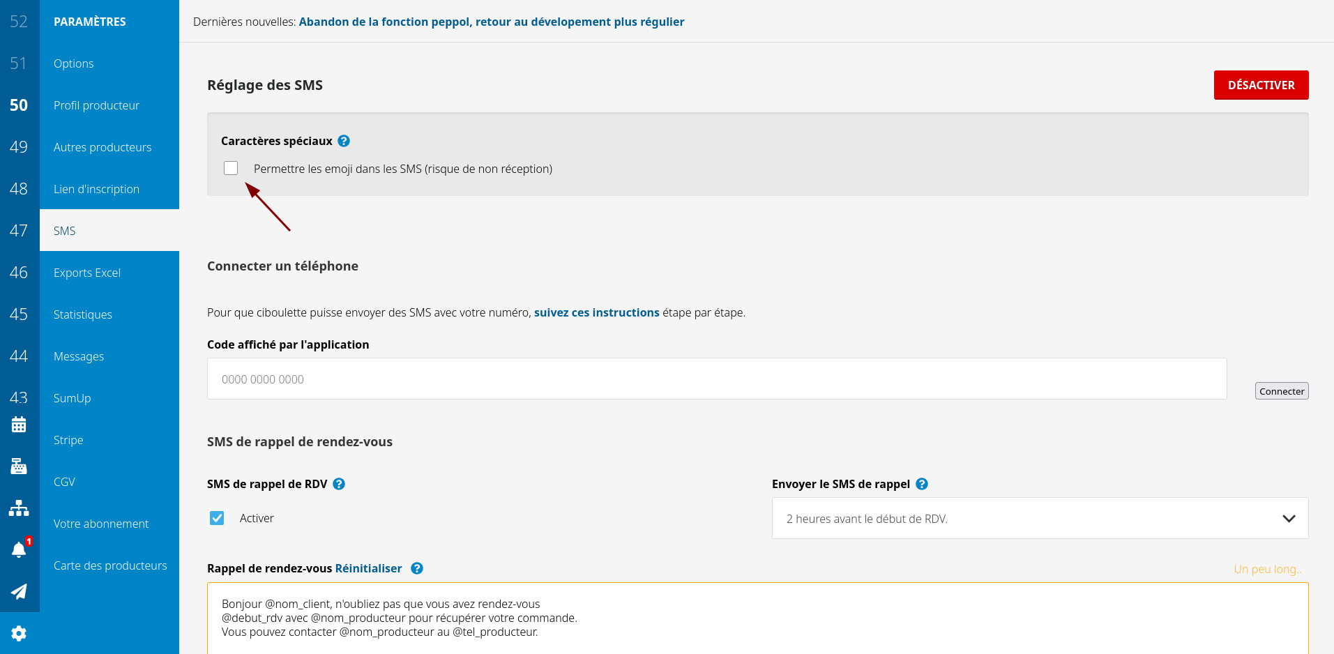 Les emojis dans les SMS sont maintenant désactivés par défault. Si ça pose problème, vous pouvez les réactiver dans réglages / SMS, mais attention, leur envoi peut poser des problèmes de réception sur certains téléphones, pour certains emojis.