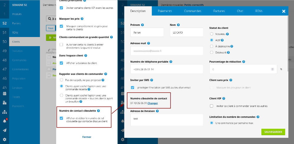 Une nouvelle option vous permet de changer le numéro de téléphone utilisé par ciboulette pour contacter vos clients (numéro français). On a eu des problèmes de non réception récemment, ça pourrait aider.