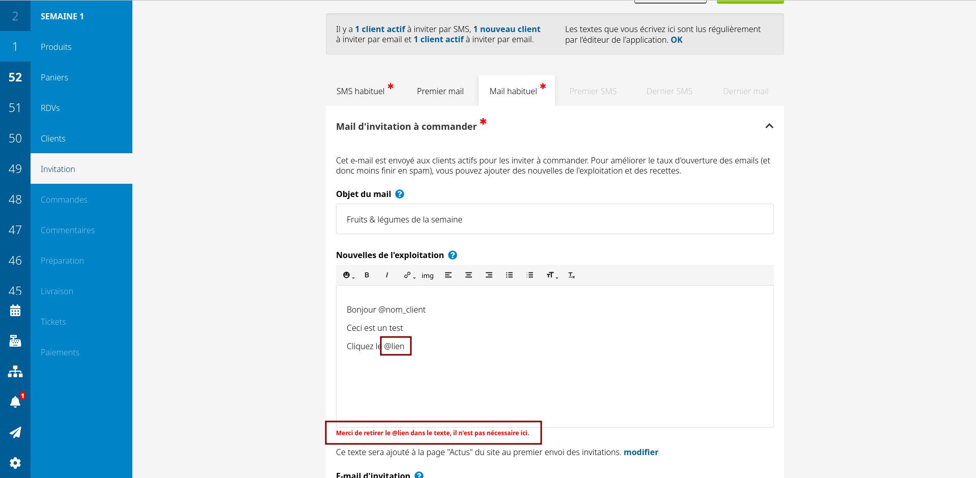 Mettre un tag @lien dans le texte d'intro par email est contre productif, donc l'envoi sera bloqué si vous le faites, avec un message indiquant le problème.