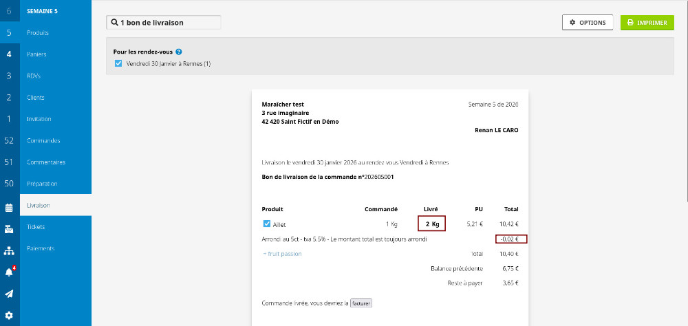 l'arrondi est fait après l'ajout des frais de livraison et ligne divers