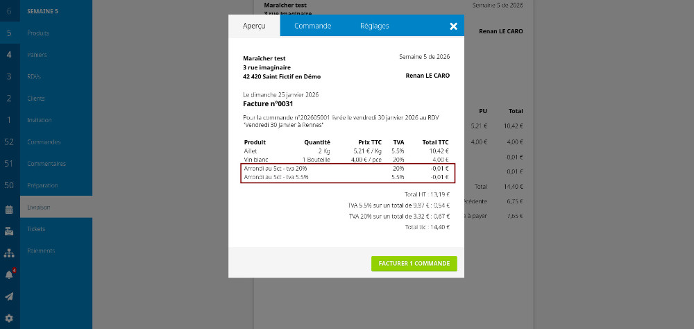 Si vous avez plusieurs taux de tva dans une commande, l'arrondi est réparti au pro rata du total par taux.
