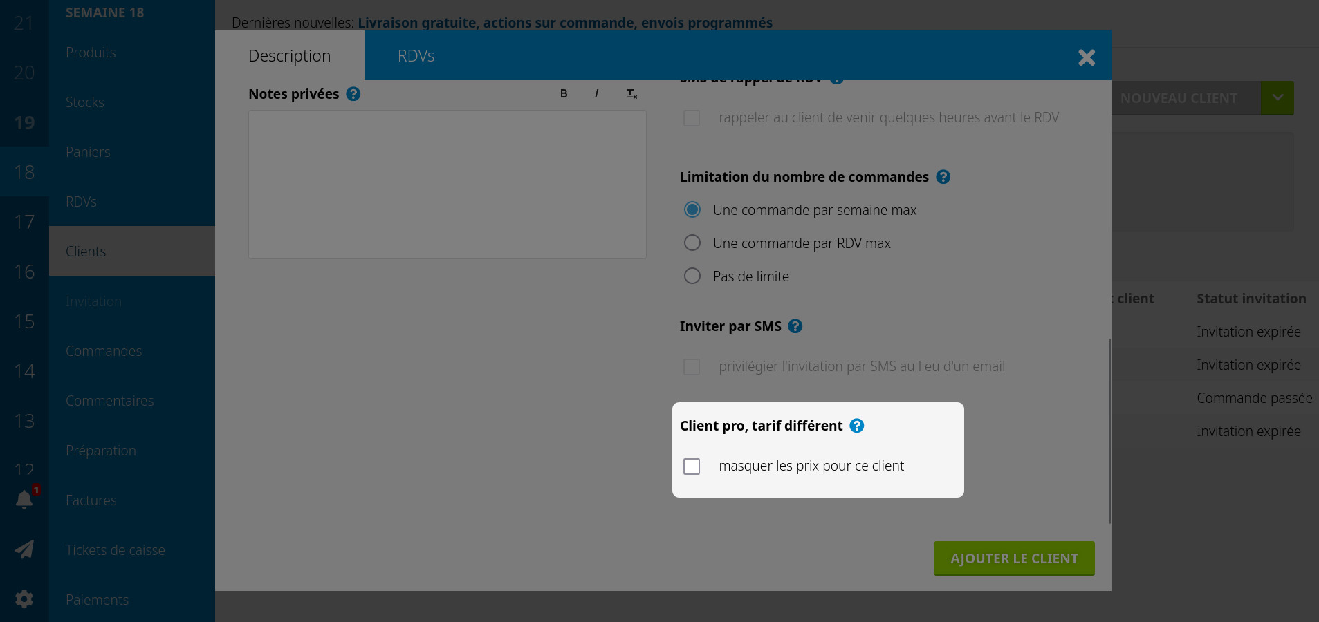 Si vous souhaitez prendre les commandes des pros via ciboulette, mais vous avez des tarifs très différents pour eux, vous pouvez cocher la case "masquer les