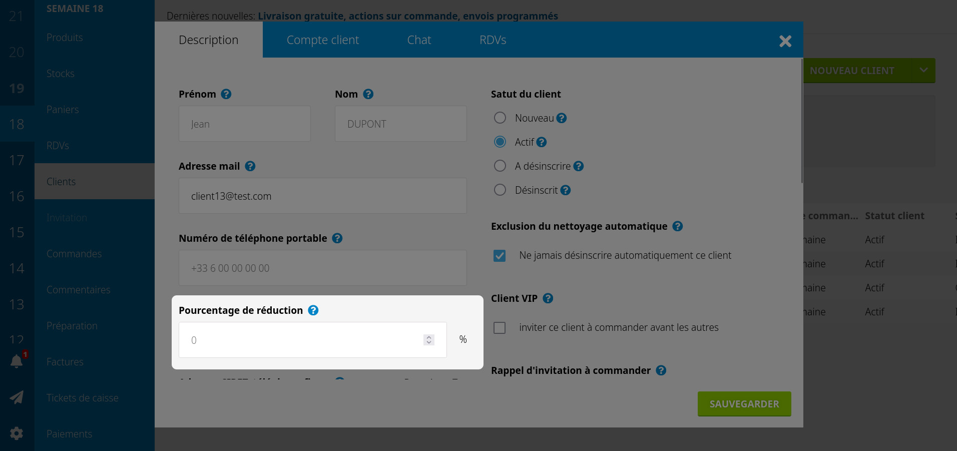 Le plus simple est d'activer l'option "réductions par client", puis d'entrer un pourcentage de réduction pour les clients pros.