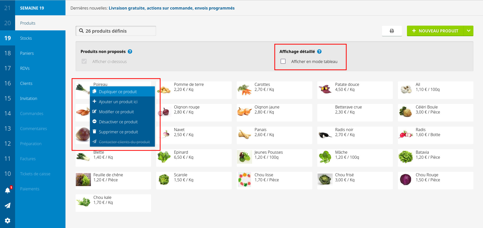 Ensuite, allez dans produits / paniers, assurez-vous d'être en mode liste et non tableau, faites un clic droit sur les produits ou panier, puis dupliquer, et créez une copie avec un tarif différent, uniquement commandable au RDV pro.
