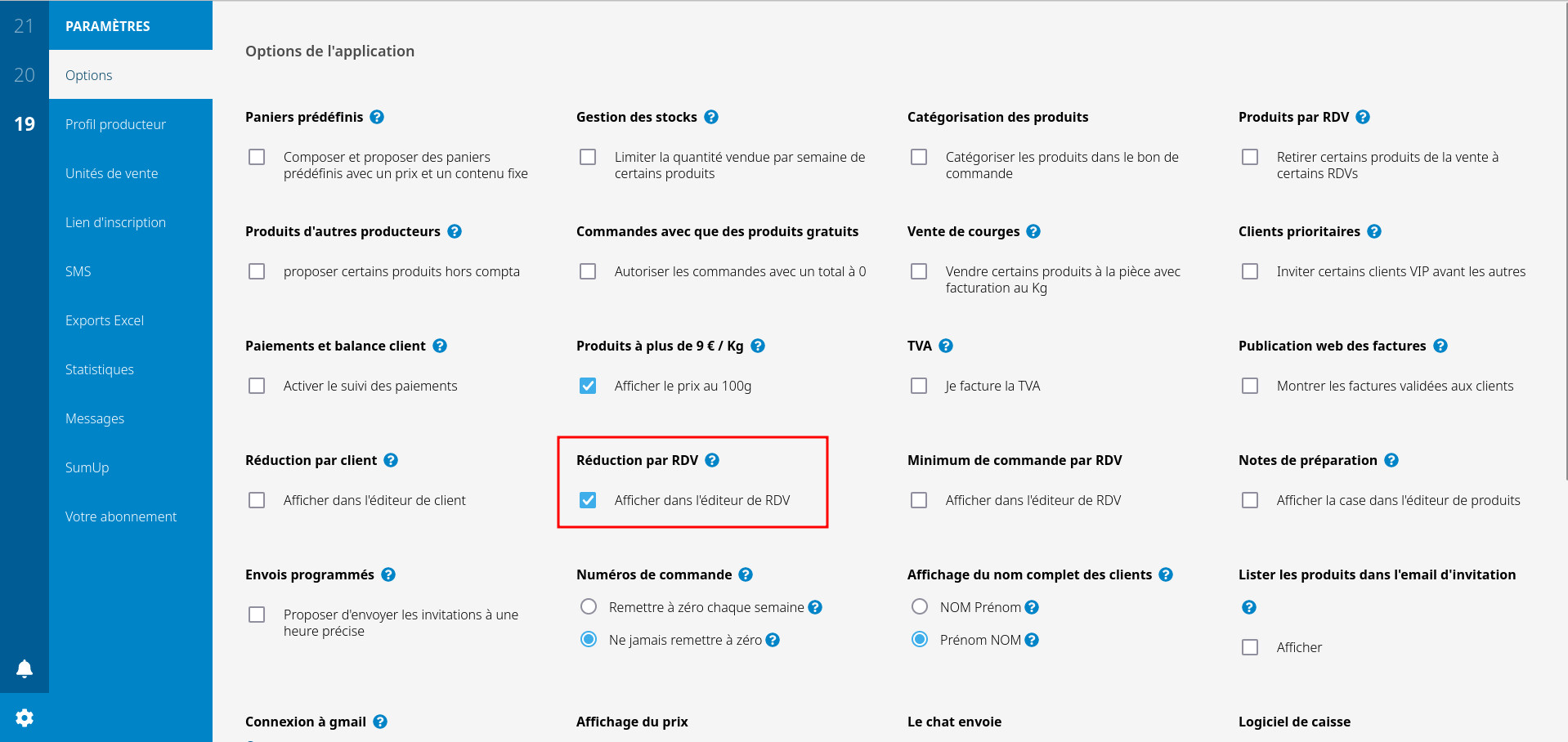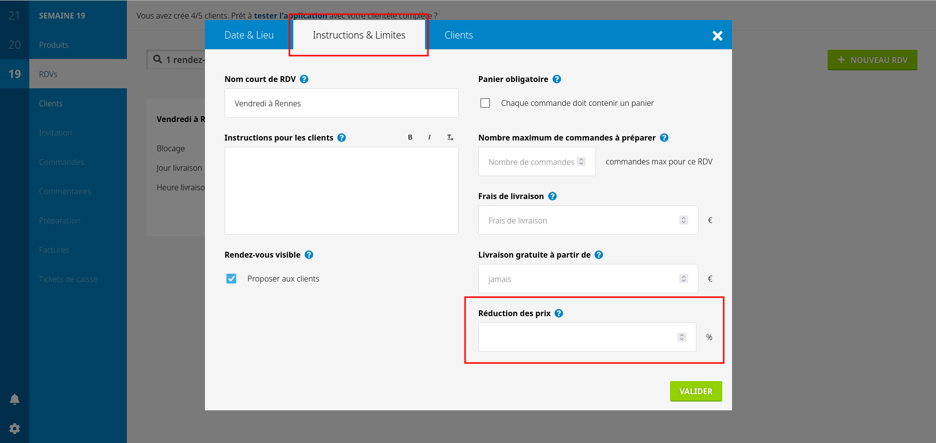 Vous pouvez cocher les options "réduction par rdv" ou "réduction par client", puis entrer un pourcentage de réduction.